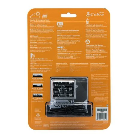 The Cobra CXY900 is a rugged two-way radio that is an ideal communication tool for serious outdoor enthusiasts. Key features of the CXY900 include a communication range of up to 40 miles*, IP-54 dust protection and waterproof rating, an emergency alert button, and an extended battery save feature. The CXY900 provides 7 NOAA channels for local weather alerts and includes 50 preset channels with 121 code combinations, providing endless options to communicate with reduced noise interference. The CXY900 radio is compatible with many leading headsets for a private listening experience, and comes equipped with a micro-USB charging cable for convenient charging at home or on the road. The CXY900 is ergonomically designed to allow for a snug fit in the palm of your hands. Its large buttons allow for ease of use with gloves. The Cobra CXY900 two-way radio is a great solution for any of your rugged indoor or outdoor communications needs. Be sure to take it on your next adventure!Â