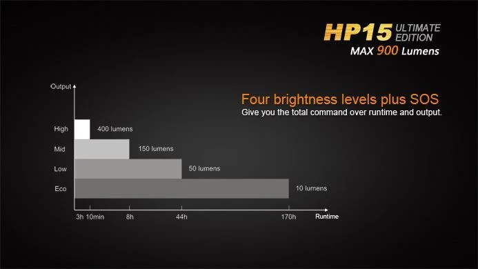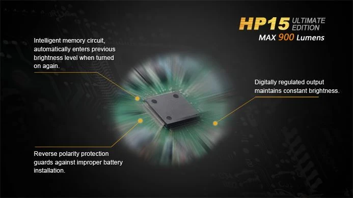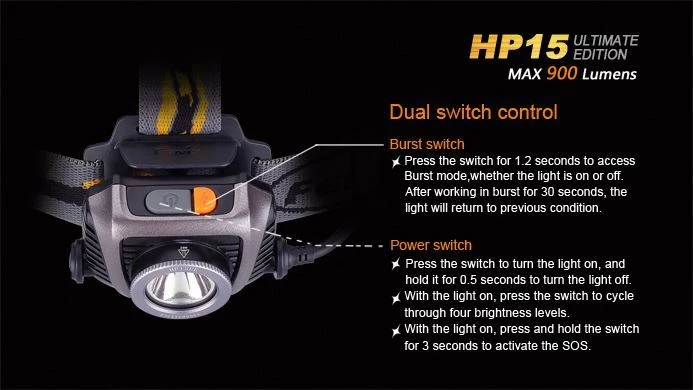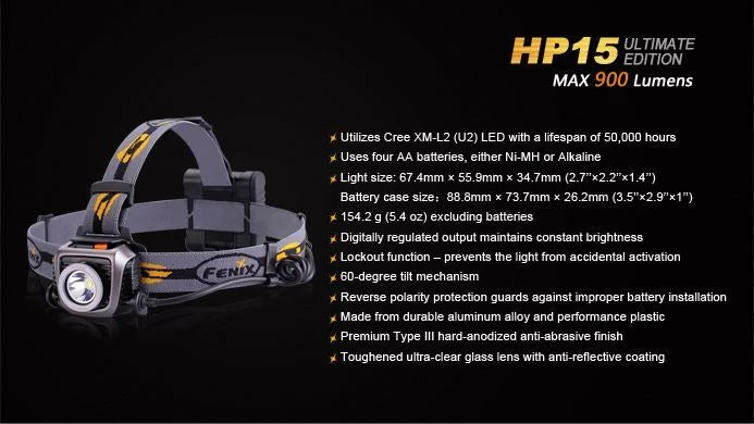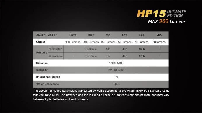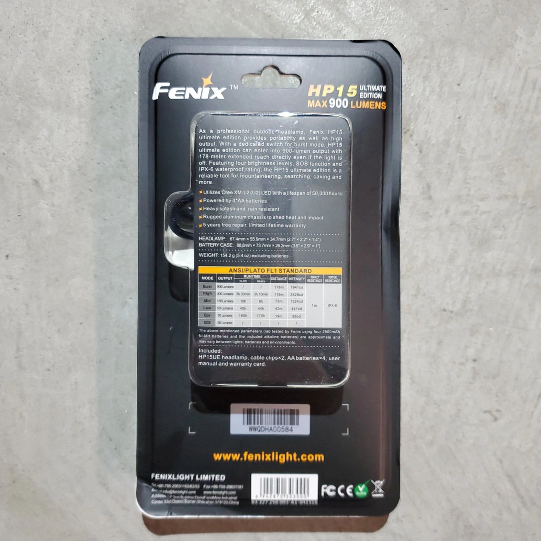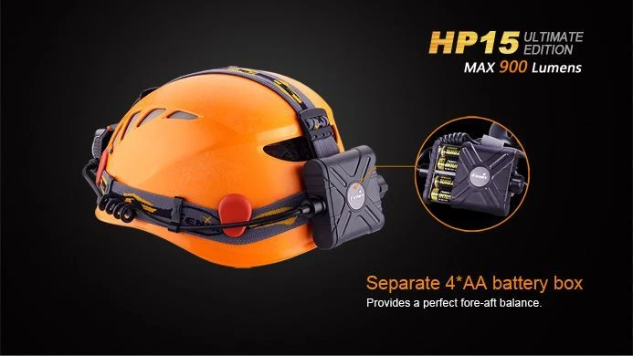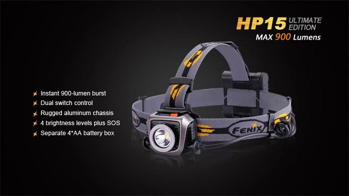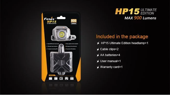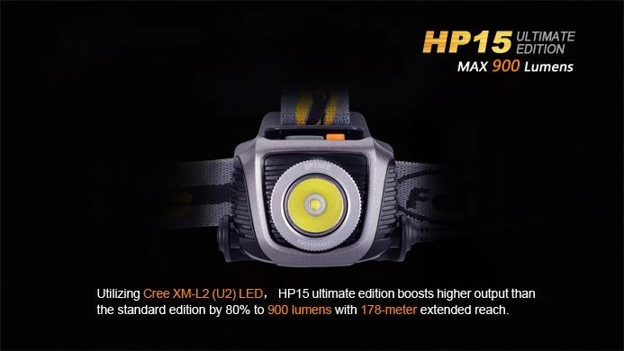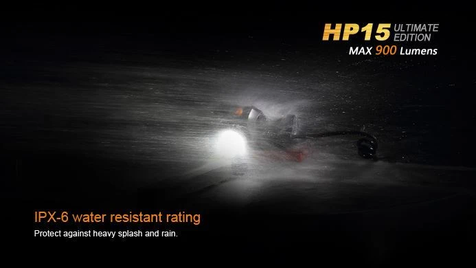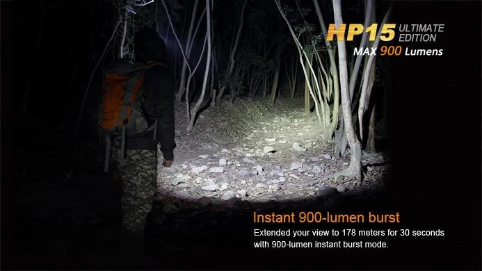 The Fenix HP15 Ultimate Edition Headlamp has 4 main brightness level plus Burst mode. Press the Burst switch for instant access to 900 lumens and a maximum beam range of 178 meters (583 feet). The Fenix HP15 UE runs on common AA batteries – either alkaline or NiMH rechargeable. The Fenix HP15 UE is water-resistant and built for all weather use.