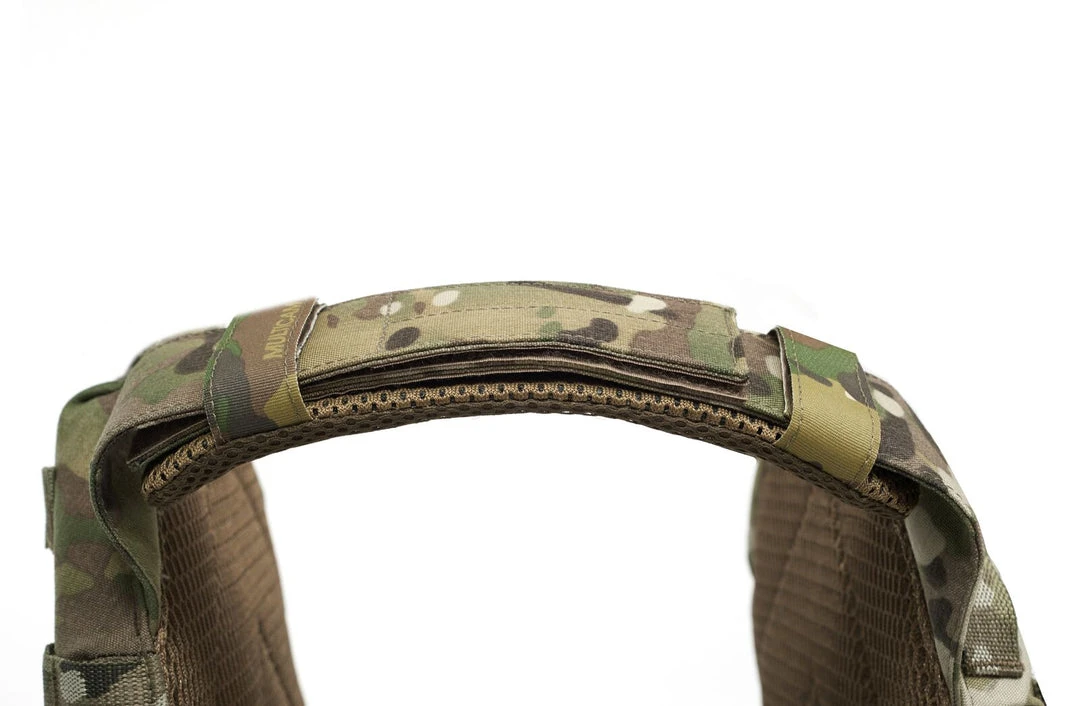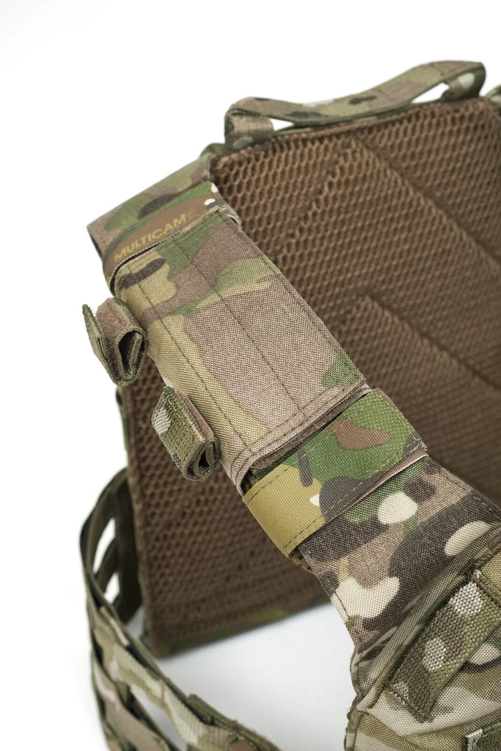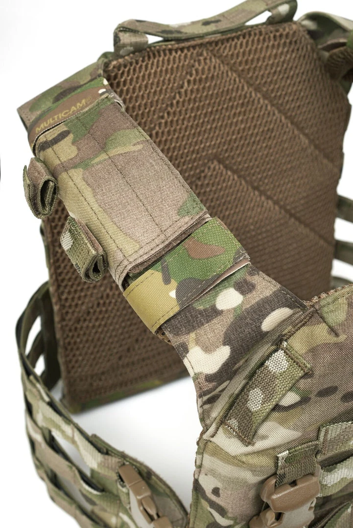 The RPC has been developed to hold medium and large SAPI and ESAPI stand alone plates and the most common 10” x 12“ I.C.W. plates available. Plate pockets have been backed with 3D mesh for added ballistic performance, comfort and dispersal of body heat. The Recon Plate Carrier comes standard with ladder style cummerbunds that attach to the RPCs front via 2 removable ITW SR Clips. This allows rapid access when getting in and out of the RPC (ITW SR Clips have a combined breaking strength of 600lbs per side). The RPCs shoulders can be worn in 3 different configurations as a slick low profile with the addition of Velcro padded shoulders and wrap around sleeve for hydration and comms channelling.