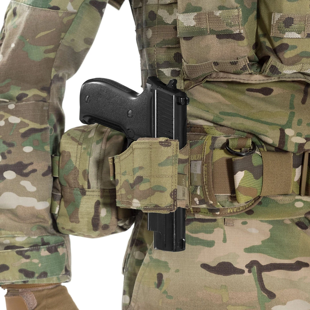 The rear of the holster has 3 rows of MOLLE webbing with 2 MOLLE arms, which allows it to be attached to a diverse range of Warrior Assault Systems gear such as the PLB belt, Frag Belts, Cobra belts and Rigger Belts. The UPH’s MOLLE also allows it to be attached to armour carriers and chest rigs such as the 901.